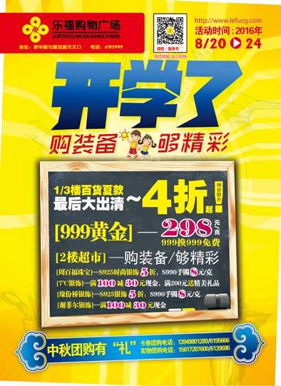 乐福购物广场8月20日至24日“开学季”! 1/3楼百货夏款最后大出清全场4折起,特价除外; 2楼超市—购装备/够精彩; 中秋团购有“礼”—卡券团购电话13949801289/实物团购电话15617287600! 德诚黄金—999黄金298元/克,999黄金换999黄金免费; 7℃银饰—满100元减30元现金,满200元送精美礼品; 周百福珠宝—S925时尚银饰5折,S990手镯8元/克; 谢菲尔银饰—满100元减30元现金; 缘份桥银饰—S925银饰5折,S990手镯8元/克; 一楼皮具专柜—背包39元起,拉杆箱119元起;天宇数码专柜—vivo oppo手机大促销,购机即送十重豪礼!活动期间可到专柜免费领取礼品,每天限量100个,特价老年机39元起; 林氏茶厂专柜—花茶满30元减10元,满50元减20元,满100元送马克杯一个,满200元送茶溢杯一个,满300元送双层保温杯一个,满500元送一壶六杯茶具一套,满1000元减200元现金,茶台全场7折; 奈尔美甲专柜—盘发头饰7折,满268元送88元美甲一次,美甲满58元做一次送一次,美甲充300送300; 纤美国际专柜—甲护5元/次(每人仅限一次),进店消费加5元即可享受价值100元甲油胶一次,现金消费90元即可享受价值188元CC品牌甲油胶一次,进店现金消费凭学生证即可享受半价优惠,充值卡充300送300再送手摸体验一次; 妈咪宝贝专柜—丽婴房清清宝第一桶正价,第二桶半价,防溢乳垫第一盒正价,第二盒半价,新款韩国笨笨鼠保温水杯到货,超长保温、防漏、防渗,专柜购物满99元送双面语音挂图1张; 机器猫童鞋—品牌升级,开学季秋款上新,款式多多,优惠多多; 3楼雪梦洁专柜—夏款睡衣15元起,特价文胸20元每/-件,男士内裤9元/条!3楼伊人岛专柜—开学季特惠节震撼开幕:5*7学生棉被69元起,5*7羊绒三件套58元/套,5*7纯棉三件套98元起,1.2米纯棉床单29元/条,5*7羊绒床单16元/条,羊绒枕皮9元/对!7*7提花四件套原价1180元/套现490元/套惊爆清仓,数量有限,花型经典,抢完为止! 3楼金盾专柜—季末清仓,夏款短袖9元起; 3楼福仔儿童乐园—办卡优惠100元/10次,200元/25次,300元/60次! 详情见店前海报!  |