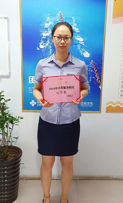 后勤服务明星:贺丽丽 该员工平时工作勤恳、认真、负责,业务水平也在学习中不断提高,不但执行力强,且工作配合度也好,有积极向上的工作心态,能主动协助其他同事工作,并且能按时完成上级领导安排的相关工作。是大家学习的榜样!