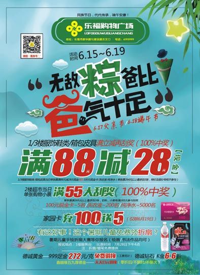 二楼超市满55能买免费抽大奖了,100%中奖,,你有没有很心动呢??当端午节遇到父亲节,我们的三楼百货活动也是劲爆,满88元直接减28元现金, 另外我们的二楼超市也为你准备了很多低价商品,心动不如行动快快行动吧~~~~~~~~~